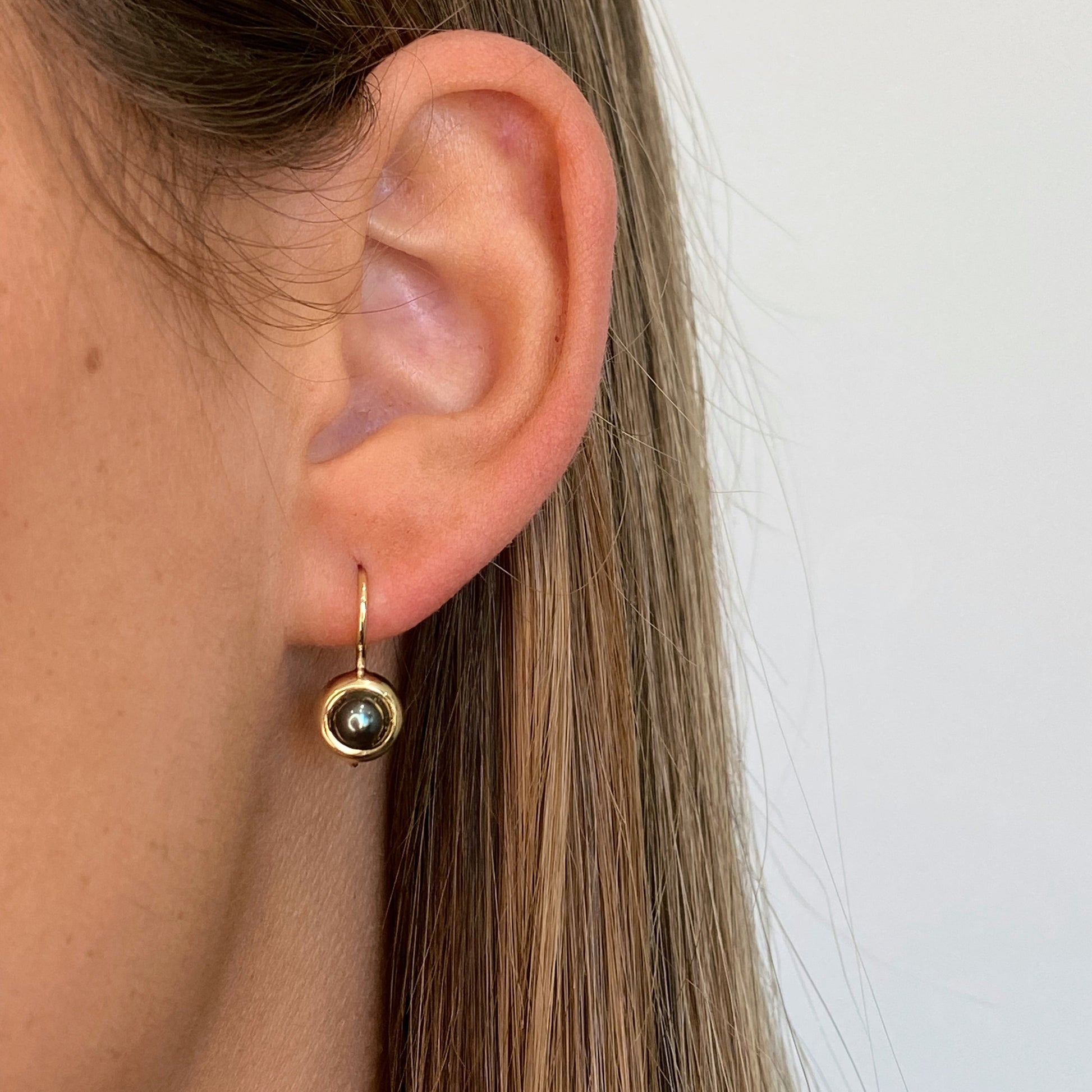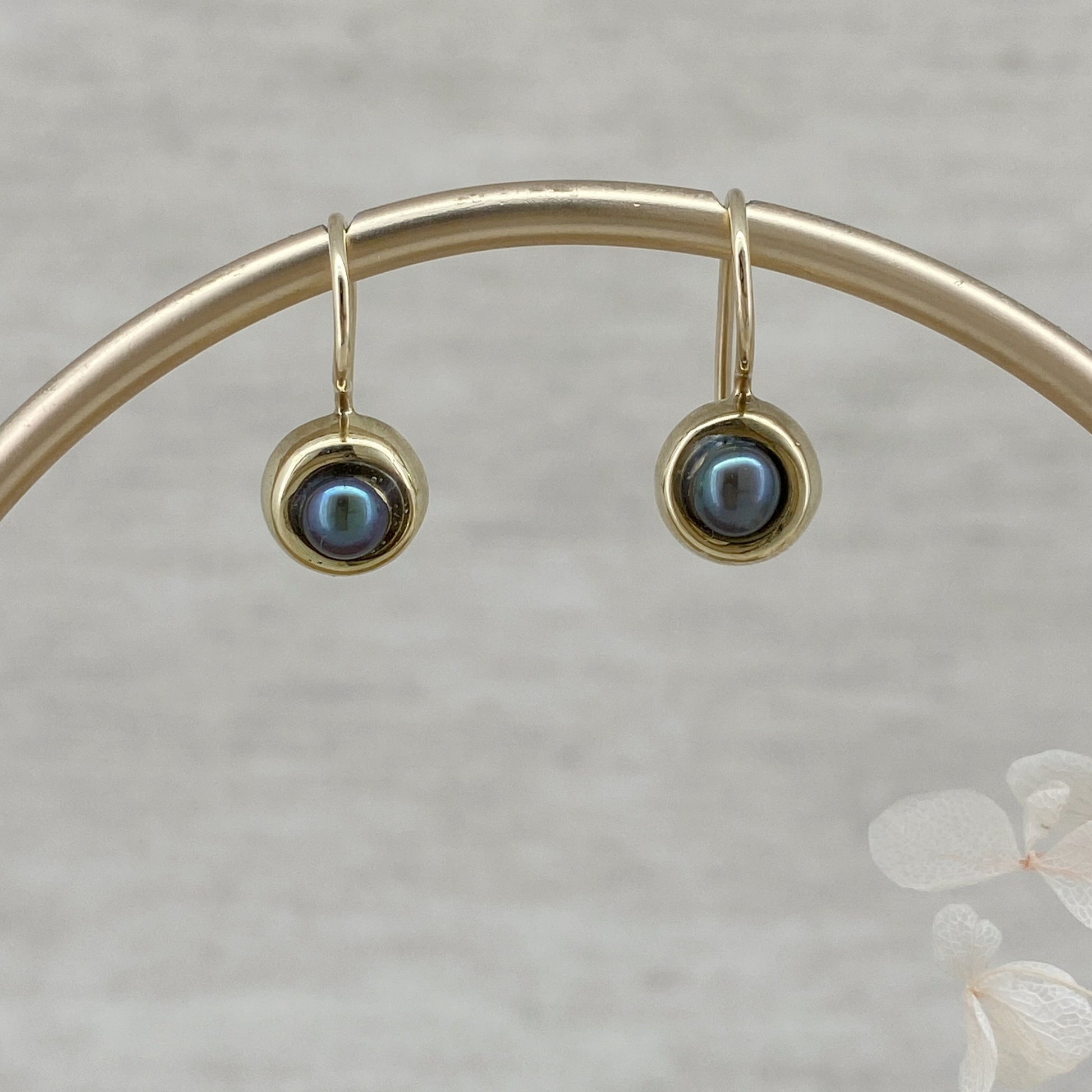 These elegant handmade earrings feature luminous peacock freshwater pearls set in warm, solid 9ct yellow gold. Each pearl is bezel-set in a smooth, polished gold frame, allowing its natural iridescence—flashes of deep green, blue, and violet—to shine through beautifully.