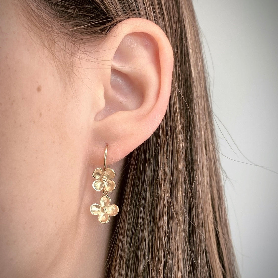 Each earring showcases two beautifully sculpted four-petal flowers, suspended gracefully from a classic gold hook. The slightly brushed texture gives the petals a soft, organic finish that catches the light with a subtle shimmer. Lightweight yet full of character, these earrings offer a refined botanical aesthetic that feels both timeless and contemporary.