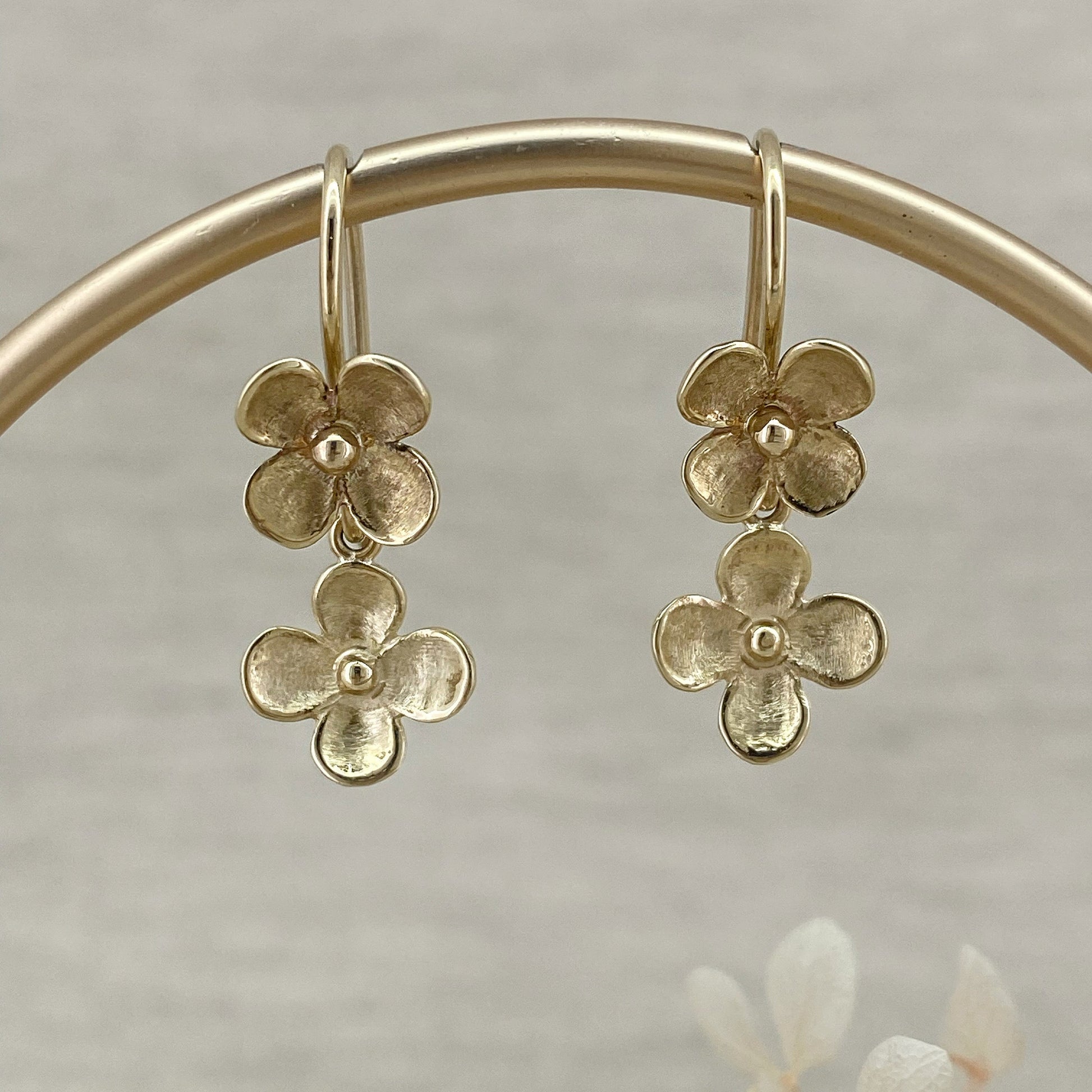 These charming handmade earrings are crafted in solid 9ct yellow gold and feature a delicate double-flower drop design, perfect for adding a touch of elegance to any outfit.