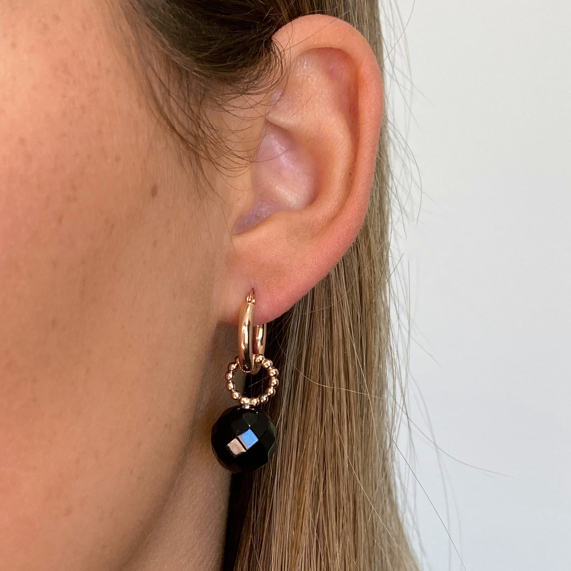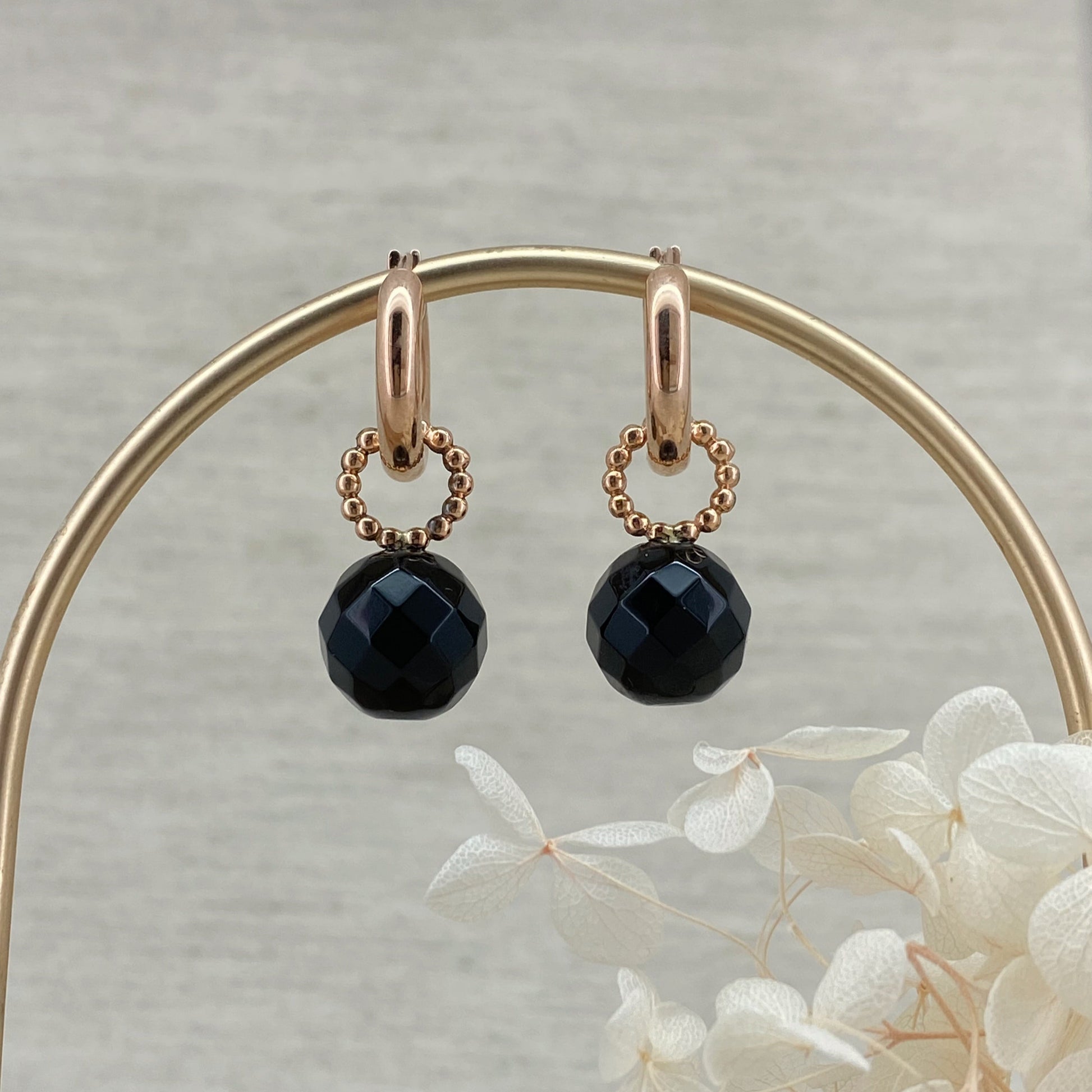 These elegant handmade earrings are crafted in 9ct rose gold and feature beautifully faceted onyx beads that catch the light with every movement. The design blends classic charm with a contemporary edge—smooth rose gold hoops suspend delicate beaded rings, each adorned with a lustrous black onyx drop.