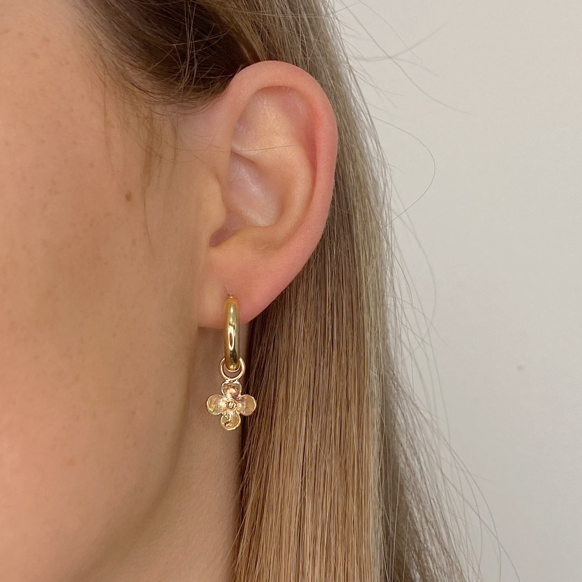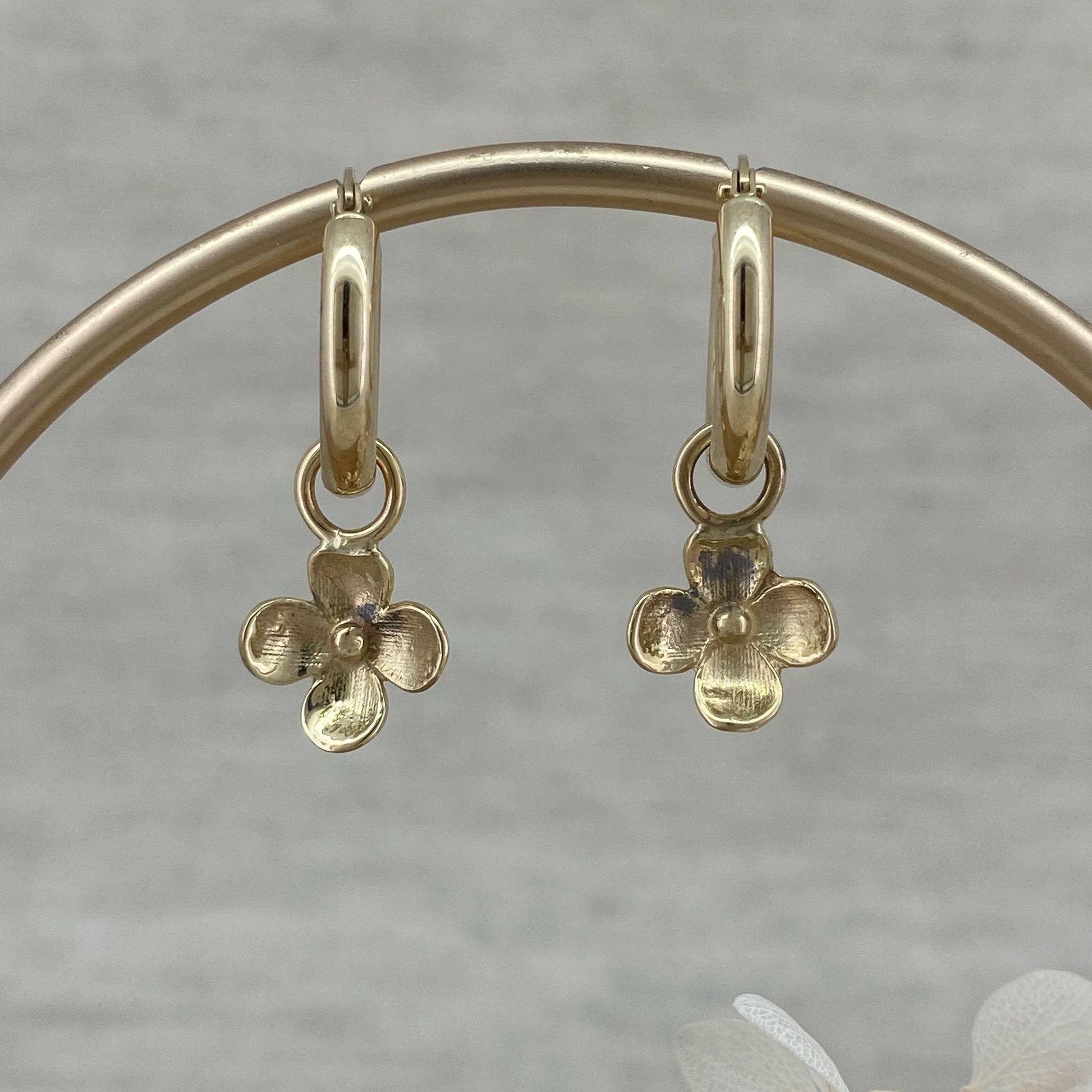 Delicately feminine and effortlessly elegant, these 9ct yellow gold hoop earrings feature beautifully crafted brushed gold flower charms that sway gently from each hoop. The soft matte finish of the flowers adds a subtle contrast to the polished gold hoops, creating a look that is both modern and timeless.